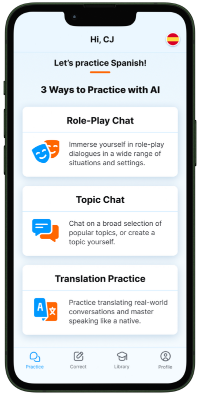 Select from various role-play scenarios or enter your own, translate the A.I. chatbot's statements, and receive real-time corrections.