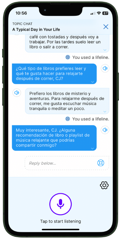 Engage in discussions on chosen or custom topics. The A.I. chatbot is programmed to keep the conversation flowing and your language skills growing.